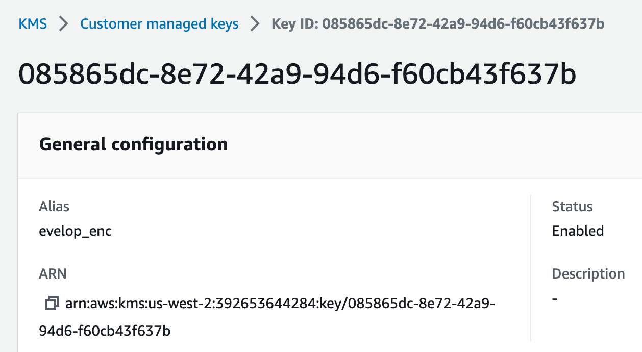 "KeyId": "arn:aws:kms:us-west-2:392653644284:key/085865dc-8e72-42a9-94d6-f60cb43f637b",